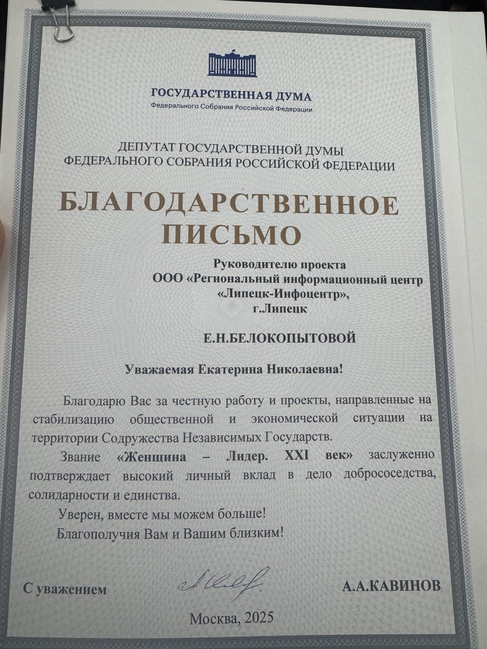 Руководитель Совета и комитета по правовым вопросам и консалтингу Липецкого регионального отделения «Деловая Россия» Екатерина Белокопытова награждена в Государственной Думе Российской Федерации Благодарственным письмом.